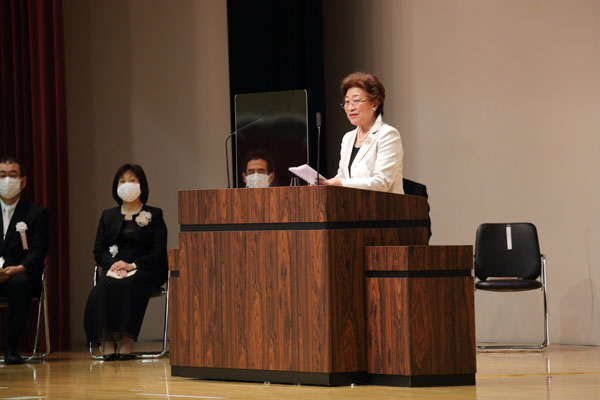 深代学長の入学許可宣言に続き、健康スポーツ学科に入学した淺井杏奈さんが代表として宣誓を行いました。学長式辞、理事長挨拶と続き、在学生代表の根本さくらさん(健康スポーツ学専攻4年)が歓迎の辞を述べ、会場では真剣な表情で聞き入る新入生の姿が見受けられました。