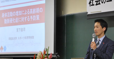 2016年12月3日(土)に第27回公開研究フォーラムを開催しました。今回のテーマは、「社会的ニーズに応える研究の展開」。基調講演では、京都大学名誉教授・京都産業大学教授の森谷 敏夫先生に「運動が現代人の心と体の健康に果たす役割」と題した講演をして頂きました。森谷先生のパワフルかつユーモアをまじえた講演に本学の学生も非常に感銘を受けていたのが印象的でした。また、セッションⅢでは「スポーツ科学研究がつくる新しい価値」と題し、2名の先生方にご講演いただきました。本学体育学部の永野 康治准教授は、「動作解析からみた前十字靭帯損傷危険因子と予防のポイント」について講演していただきました。さらに、早稲田大学スポーツ科学学術院の宮下 政司准教授は、「身体活動の増加による高齢期の動脈硬化症に対する予防策」をテーマに最新の研究データを紹介していただきました。当日は、150名をこえる学生と研究者、一般の方が参加し、盛況なフォーラムとなりました。